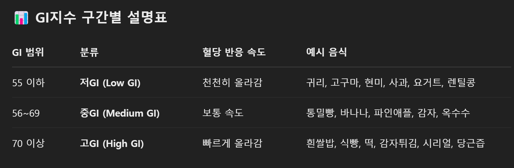 GI 지수는 음식이 혈당을 얼마나 빠르게 올리는지를 나타내는 지표입니다.