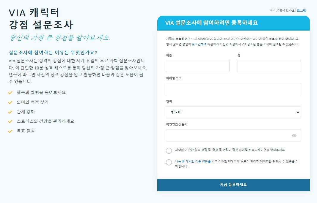 긍정심리학자의 창시자가 주축이 되어 개발한 검사를 할 수 있는 사이트입니다.